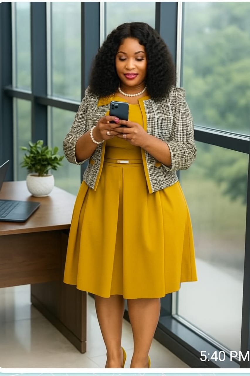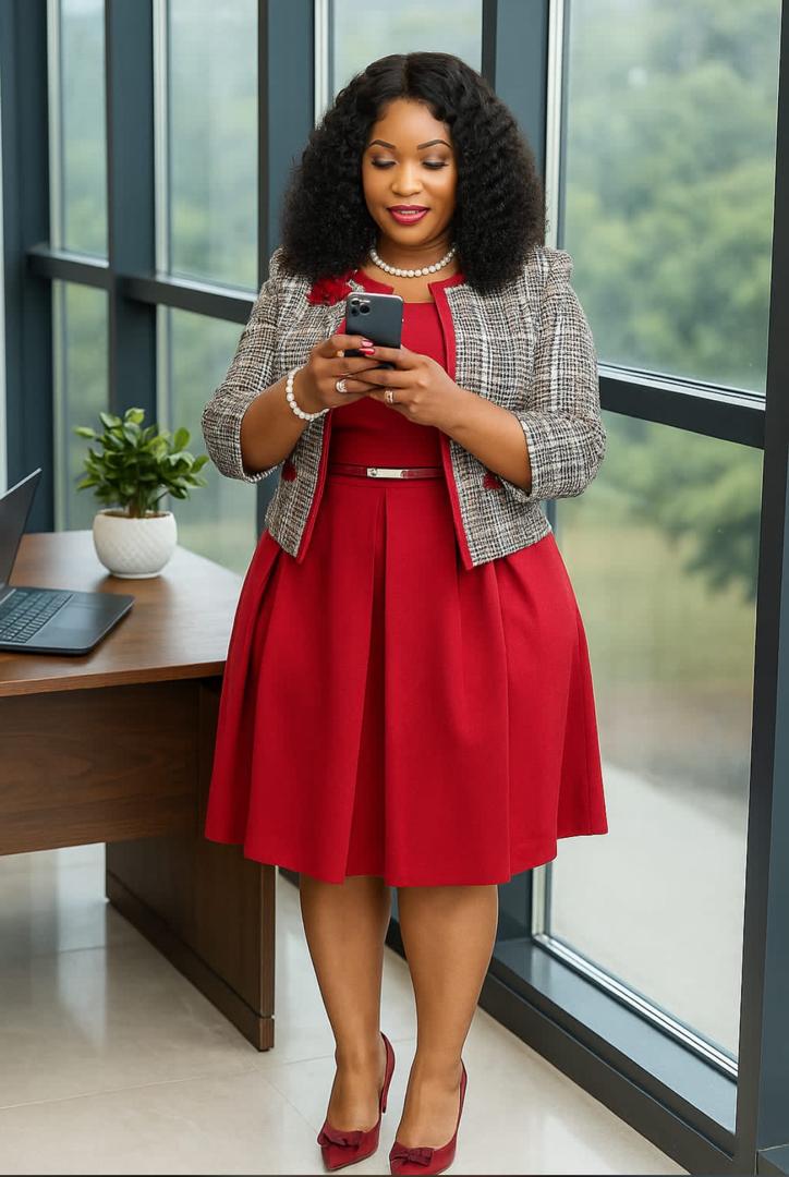 Structured Design: The ensemble features a tailored, open-front jacket paired with a sleeveless midi dress, offering a refined silhouette that maintains its shape throughout the day .